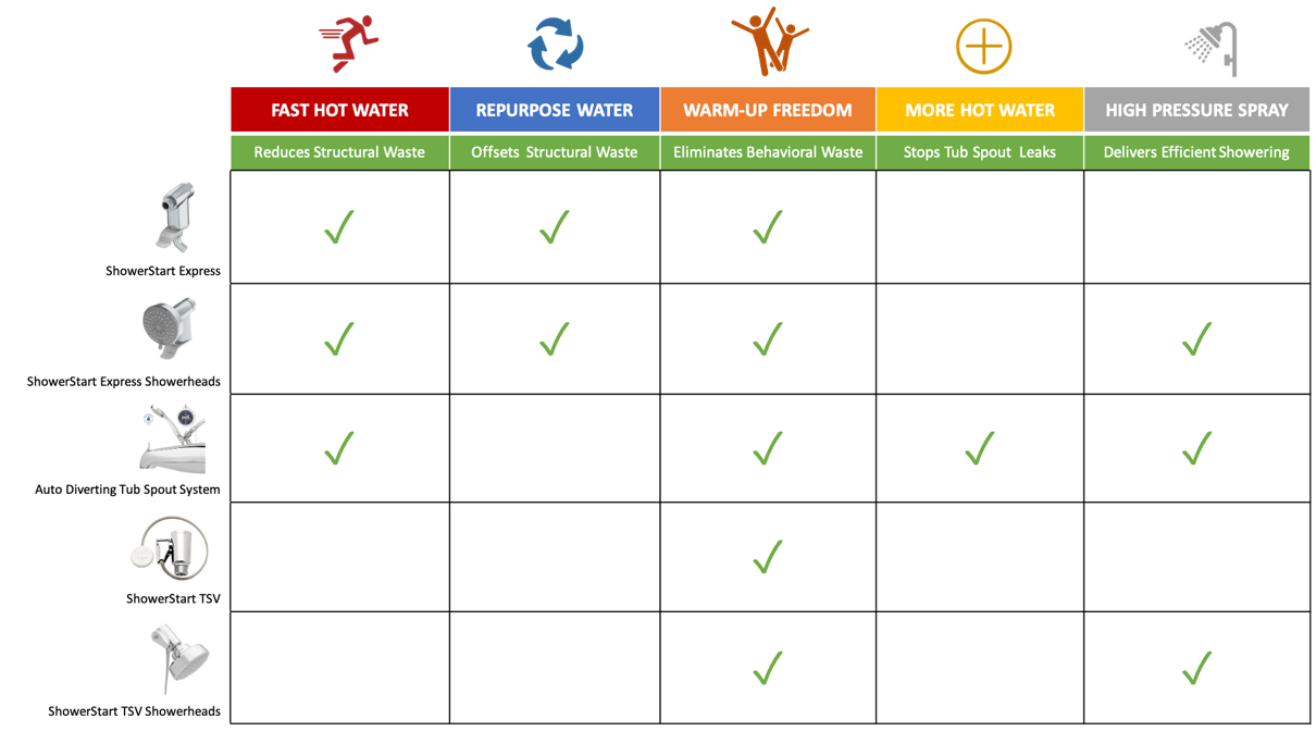 A new ShowerStart enhancement, capable of delivering Fast Hot Water, by purging Structural Waste through an Express Port at rates up to 5 gpm and then facilitating the Repurposing of that Water has been announced. Called ShowerStart Express it Reduces Structural Waste, Offsets the Residual Structural Waste and eliminates Behavioral Waste.